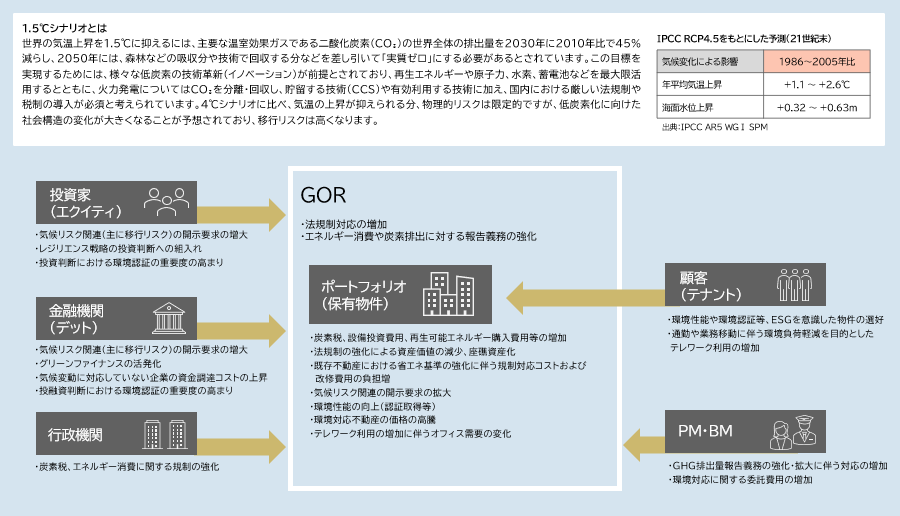 これらの認識のもと、GARは、GORが保有するポートフォリオの気候変動へのレジリエンス向上を目指すとともに、気候変動がもたらすリスクと機会を識別し、両社の経営とGORの運用方針に反映させることにより、持続可能かつ安定的な収益を長期的に確保することを目指しています。
