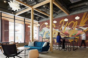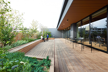 休憩や昼食スペースとして使用可能なラウンジや多目的ルーム、地域に即したラベンダーなどの植栽に囲まれた屋上テラスが設置されています。最新オフィスデザインを多数手がける世界最大のデザイン会社ゲンスラーがデザイン監修した、洗練されたデザインと働く人の快適さを兼ね備えた空間です。1階のラウンジは一般の人も利用可能で、地域貢献にも寄与しています。