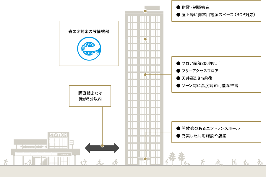 - GORが考える典型的な優良オフィスビルのイメージを図示したもので、GORの保有物件がこれらの特徴すべてを有するわけではありません。